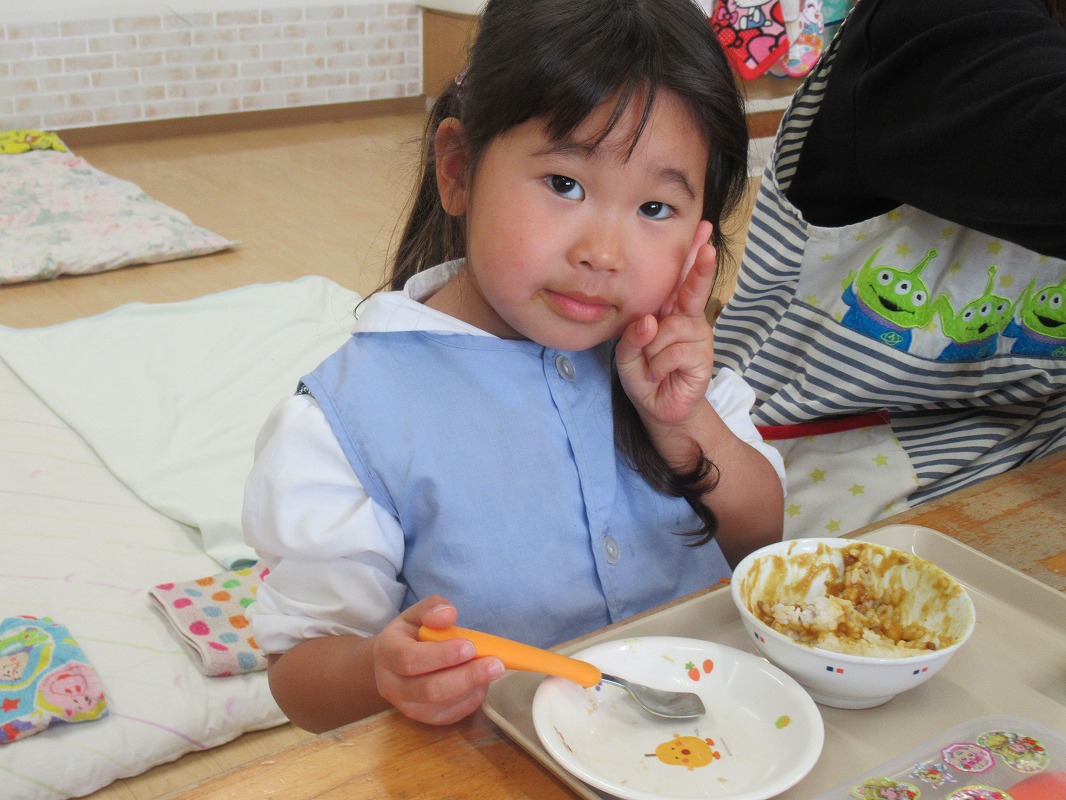 また、3時のおやつは、「チーズ蒸しパン」です。子どもたちは大好きなカレーです。いただきます~。(園長 宮﨑秀一郎)