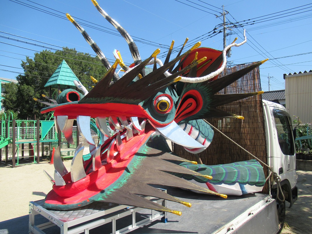 大牟田市では、毎年恒例の大蛇祭りが、コロナウイルス感染症の影響により、中止となりましたが、少しでも元気をとどけようと3分の2サイズの大蛇山を作りました。
